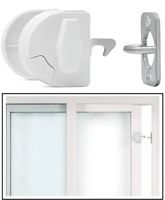 The sliding door latch is a two-way latch designed for sliding patio doors, serving as a safety measure to prevent young children from exiting. It can be disengaged** when children are not present, and is also intended to assist individuals with special needs, such as those with autism, sleepwalkers, and adults with dementia. **Disangaging feature is not acceptable for pool safe regulation.